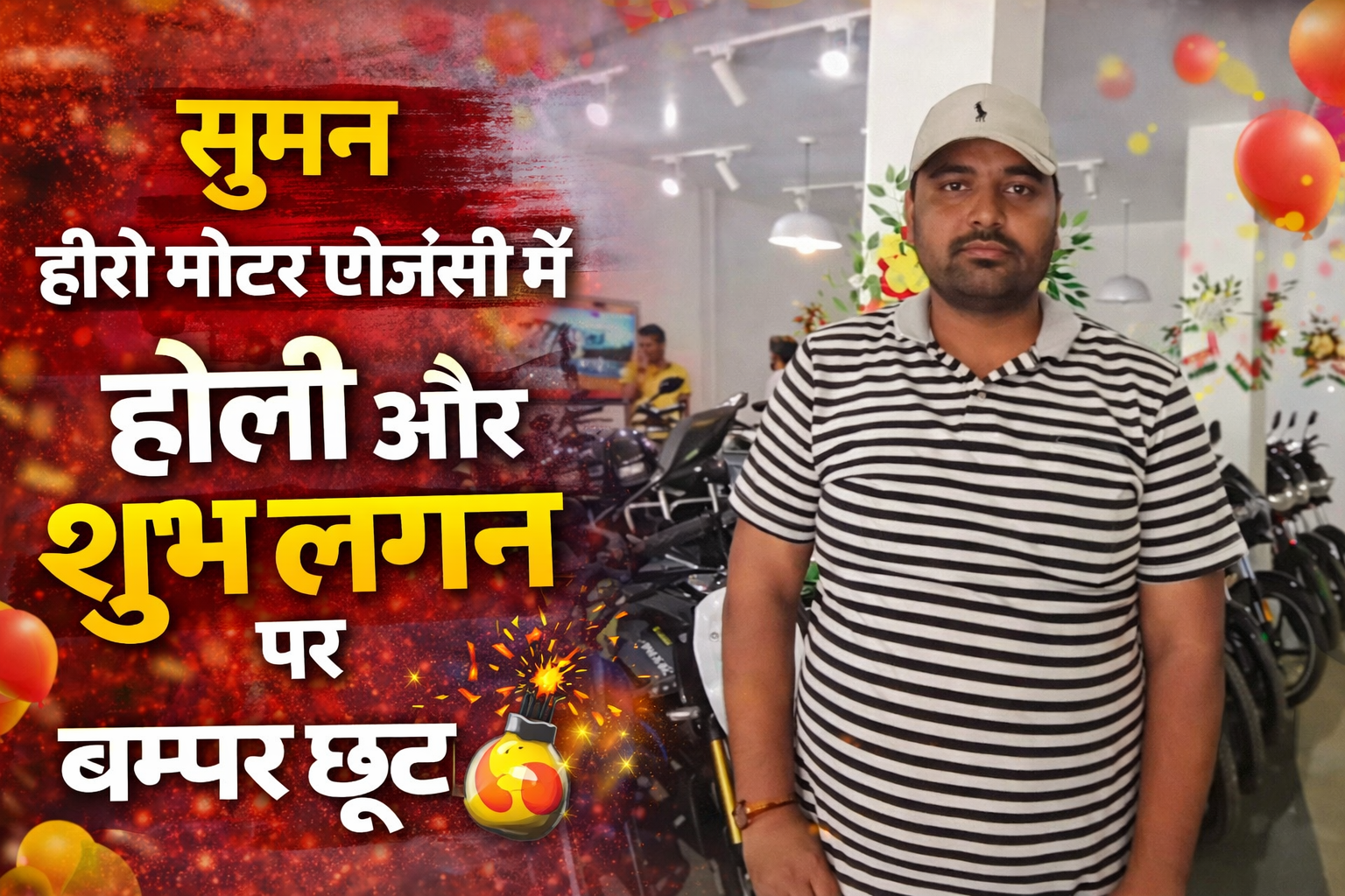 सुमन हीरो मोटर एजेंसी में होली और शुभ लगन पर बम्फर छूट और इनाम बिहार के समस्तीपुर जिले के सिंघिया प्रखंड में होली और शुभ लगन के पावन अवसर पर दोपहिया वाहन खरीदने की सोच रहे ग्राहकों के लिए बड़ी खुशखबरी है। ब्लॉक रोड सिंघिया स्थित सुमन हीरो में देश की प्रमुख दोपहिया निर्माता कंपनी Hero मोटर की सभी मॉडल और सभी रंगों की बाइक आकर्षक दामों पर उपलब्ध कराई जा रही है। डीलरशिप की ओर से बताया गया है कि ग्राहकों को यहां अन्य जगहों की तुलना में किफायती कीमत पर बाइक मिल रही है। साथ ही आसान और त्वरित ईजी फाइनेंस की सुविधा भी दी जा रही है, जिससे ग्राहक कम डाउन पेमेंट में अपनी मनपसंद मोटरसाइकिल घर ले जा सकते हैं। एक्सचेंज और इंश्योरेंस की भी सुविधा सुमन हीरो में