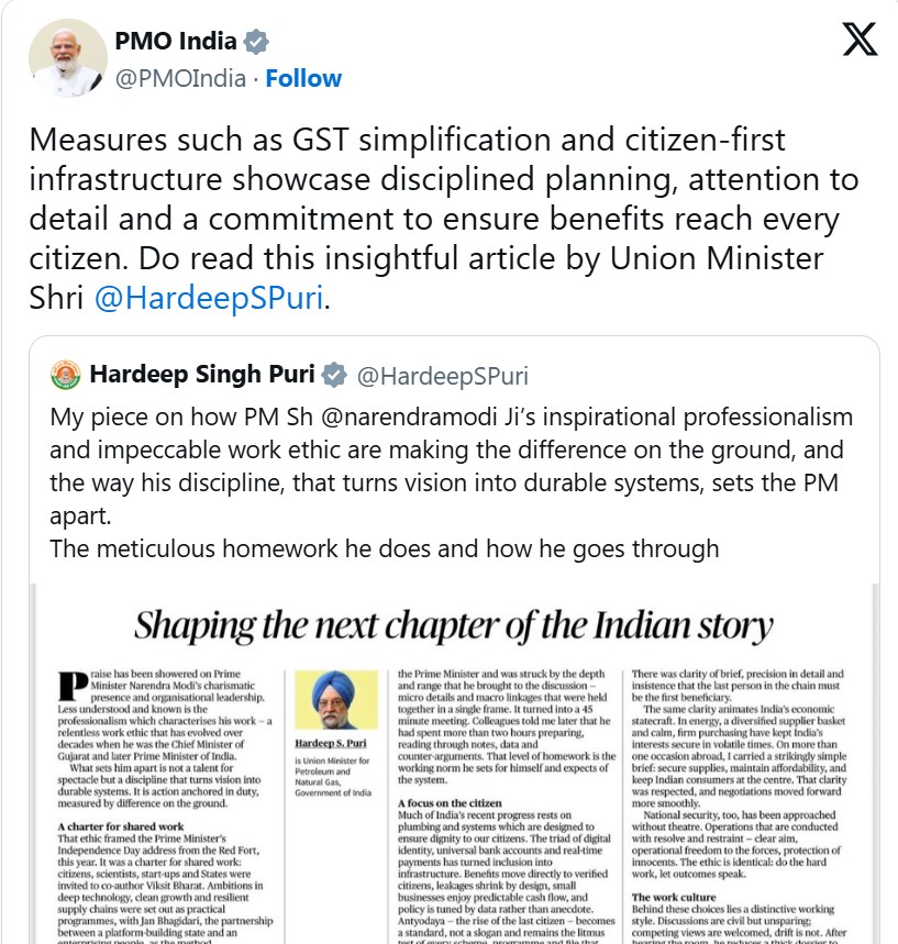प्रधानमंत्री श्री नरेन्द्र मोदी ने समावेशी शासन के स्तंभों के रूप में जीएसटी सुधारों और नागरिक-प्रथम बुनियादी ढाँचे की प्रशंसा करते हुए एक लेख साझा किया